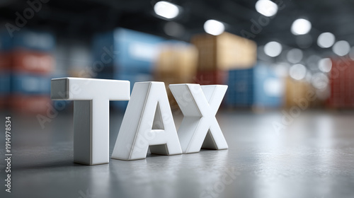 Tax Word in Warehouse: A detailed shot of the word 'TAX', standing in a spacious warehouse environment, conveys a sense of business operations, economics, and fiscal responsibility.