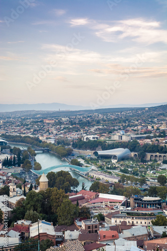 Tbilisi cityscape from a view point in the lights of sunset showing old and modern architecture with mountains in the background, Georgia