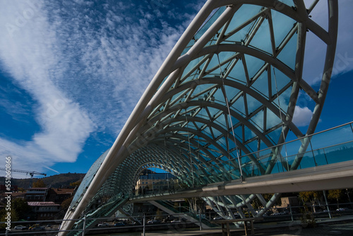 Tbilisi, GEORGIA : 05 - 10 - 2022 : The Bridge of Peace is a bow-shaped pedestrian bridge over the Kura River in old Tbilisi, Georgia