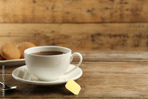Tea bag in ceramic cup of hot water on wooden table. Space for text