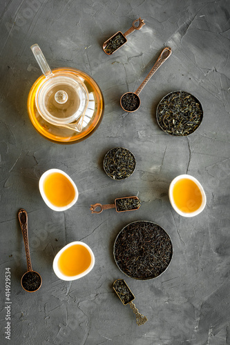 Tea ceremony concept. Hot and dry tea in teapot and cups, top view