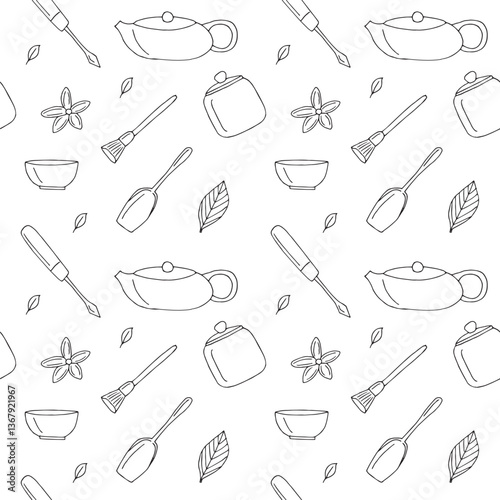 tea, ceremony, time, seamless, pattern, background, drink, doodle, icon, hot, chinese, teapot, jar, bowl, cup, spatula, tongs, knife, brush, leaf, plant, table, shepherd, jasmine, flower, outline