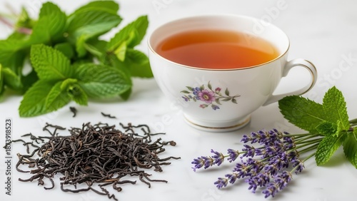 tea, cup, mint, lavandula, beverage, drink, leaf, herb, refreshment, herbal, aromatic, brewing, infusion, relaxation, calm, morning, nature, food, organic, ingredient, preparation, healthy, fresh, bloom, flower, green, purple, white, macro, closeup, lifestyle, still life, natural, pottery, ceramic, porcelain, delicate, floral, botanical, culinary, simple, elegant, rustic, clean, bright