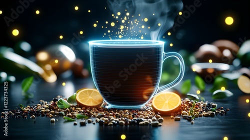Tea cup with steam, surrounded by natural detox ingredients, health vibe