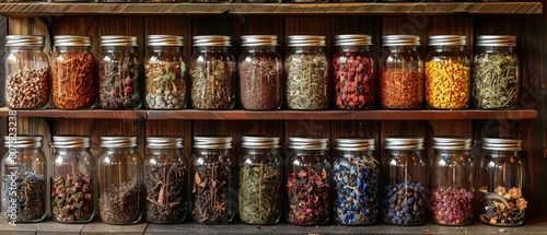 Tea healing remedies, an apothecary shelf of herbal teas, each with its own story and healing properties