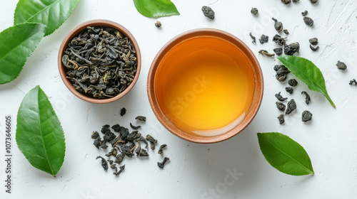 Tea leaves and teacups on white background, tea ceremony concept