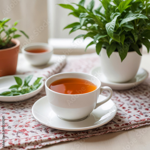 teacup, interior, concept, single, eco, houseplant, minimalism, kitchen, cup, mug, drink, tea, white, background, home, table, beverage, empty, template, simple, minimal, blank, closeup, morning, flower, design, business, ceramic, branding, coffee cup, breakfast, wooden, lifestyle, espresso, natural, copy space, coffee mug
