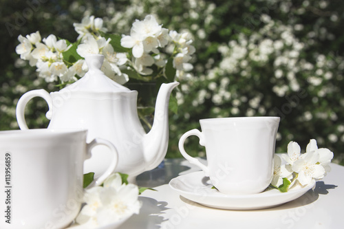 Tea service in the garden. Cups of tea and tea pot. Drinking tea