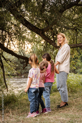 teacher, river, public park, forest, outdoors, education, learning, childhood, girl, fun, happiness, smiling, togetherness, summer, day, sunlight, tree, grass, water, preschool, avocation, playing, exploration, discovery, curiosity, growth, development, bonding, care, eltern