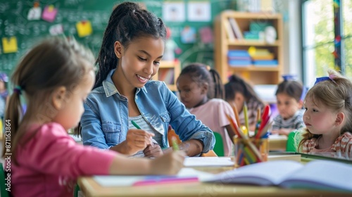 teacher, student, classroom, learning, creativity, engagement, education, children, young, school, teaching, interaction, study, children, primary, drawing, colourful, smiling, attentive, academic, cognition