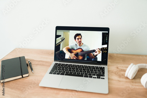 man, 20s, young adult, adult, latin, hispanic, teacher, music, lesson, class, online, video, call, laptop, teaching, playing, practicing, acoustic, guitar, chord, photogenic, attractive, student, pupil, home, lifestyle, desk, living room, earphones, notebook, agenda, creative, talent, sound, skill, portrait, eye contact, happy, happiness