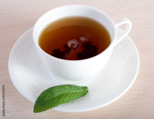 Teacup and a leaf of mint