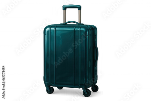 Teal hard-shell suitcase featuring extending handle, rolling smoothly against transparent backdrop, representing contemporary travel gear