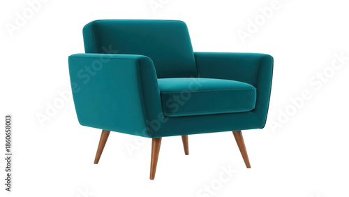 Teal upholstered armchair with wooden legs, cut out, stock png, isolated on transparent background