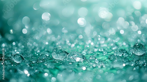Teal water droplets with shimmering bokeh effect.