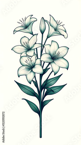 lily, lily, illustration, digital artwork, flower, botanical, floral, teal, white background, drawing, artwork, design, nature, plant, bloom, blossom, elegant, delicate, detailed, flower petals, leaf, stem, bouquet, graphic, image, visual, art, aesthetic, pretty, beautiful, white, green, line art, vector, graphic design, digital illustration, artistic, serene, tranquil, peace, calm, wallpaper, background, floral pattern
