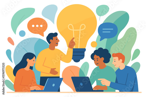 flat, teamwork, brainstorming, collaboration, creativity, office, discussion, idea, light bulb, people, communication, innovation, diverse, meeting, business, co-worker, laptop, dialogue, colourful, inspiration, digital, planning, conversation, modern, workplace, team, strategy, thought, group, interaction, design, professional, solution, synergy, concept, dynamic, imagination, technology