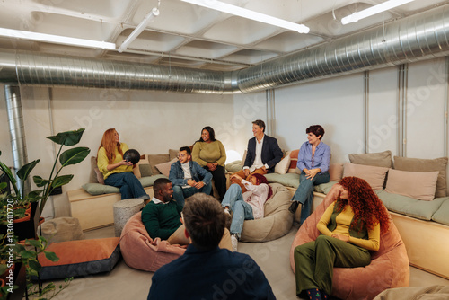 workshop, office, collaboration, communication, teamwork, relaxed, diversity, group, employee, co-worker, activity, training, business, corporate, meeting, discussion, interaction, learning, development, skill, motivation, togetherness, oneness, support, growth, coaching, mentor, leadership, relaxation, casual attire, informal, comfortable, modern, creative, workspace, indoor, plant, connection, listening, sharing, idea, brainstorming, strategy