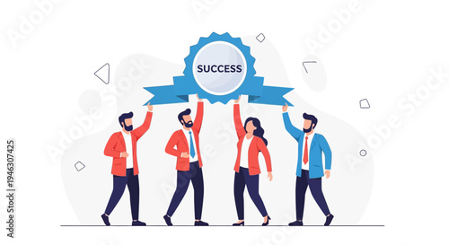 Team Celebrating Success Holding a Blue Ribbon Award with 'SUCCESS' Text