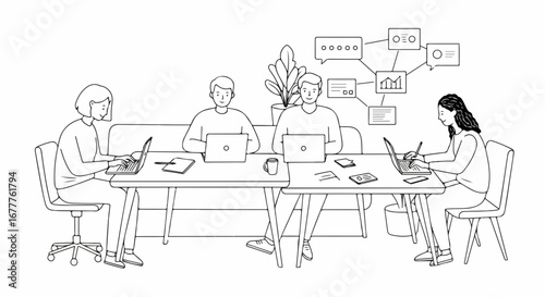 Team collaboration illustration featuring four people working at long table. Team collaboration shows focus on their laptops with connection to internet, data, and ideas.