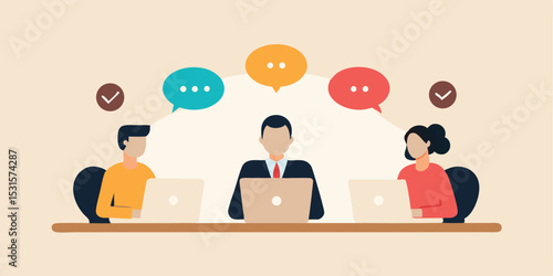 teamwork, collaboration, team, meeting, online, communication, discussion, feedback, laptop, computer, technology, cyberspace, business, office, colleague, co-worker, employee, group, people, person, man, woman, chat, message, bubble, speech, idea, project, work, professional, success, efficient, productivity, connection, network, digital, modern, concept, illustration, graphic, design, flat, style, vector