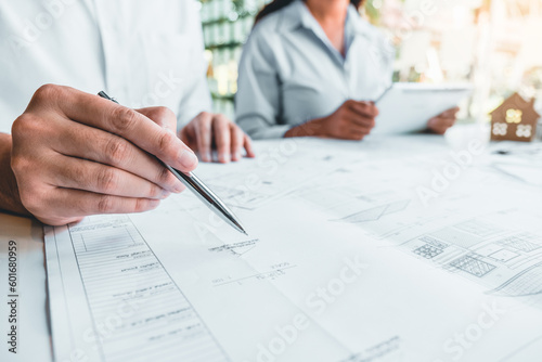 Team Engineer drawing graphic planning and meeting for architectural project on workplace