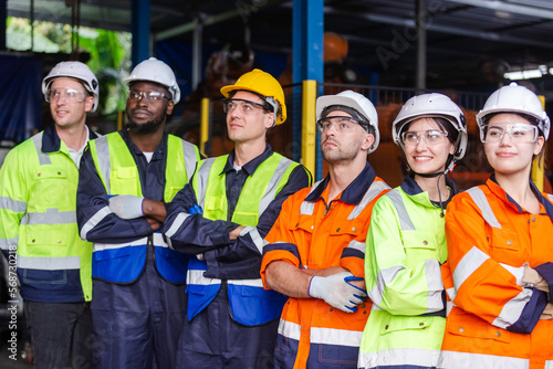 Team engineering worker technician, workshop manufacturing, Teamwork in industry factory. group professional technician industrial.
