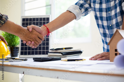 Team Engineers are shaking hand solar panel Business for home construction designs to bring them to prospective customers.concept