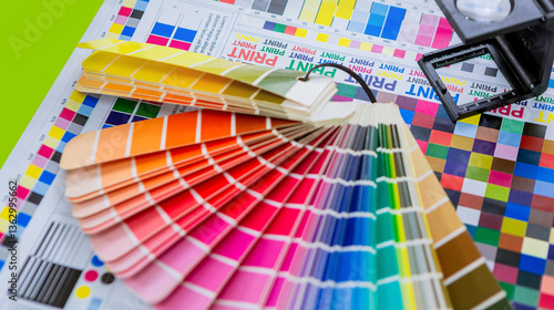 Team graphic designer checking print quality of media graphics proof print and color guides in printing industry. Selected focus
