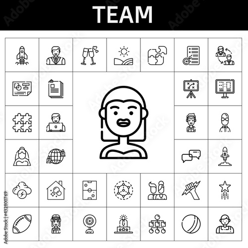 team icon set. line icon style. team related icons such as bride, modeling, housekeeping, air hockey, network, ball, startup, scoreboard, man, sitemap, conversation, cheers
