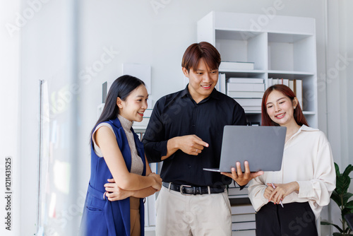Team of asian business employees celebrating success people working as a good team in the office. Successful teamwork in a meeting, workplace concept.