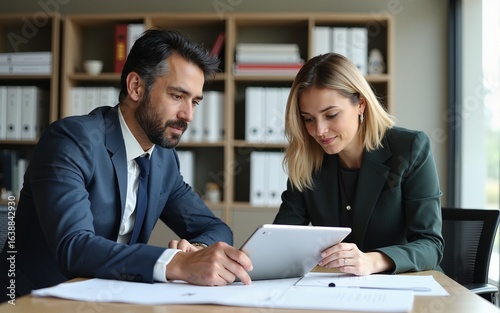 Team of diverse partners sitting at table mature Latin business man and European business woman discussing project on tablet in office. Two colleagues of professional business people working together.