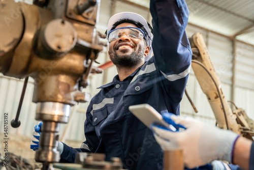 Team of engineers practicing maintenance Taking care and practicing maintenance of old machines in the factory so that they can be used continuously.