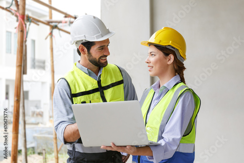 Team of industrial engineers men and women wearing helmets discussing new projects. while using laptop