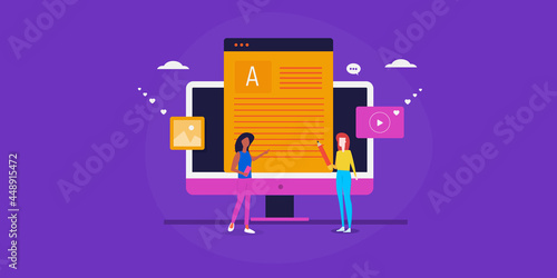Team of woman creating digital content, content writing, multi media content production. social media post, blog management, video marketing business technology communication. Flat design banner.