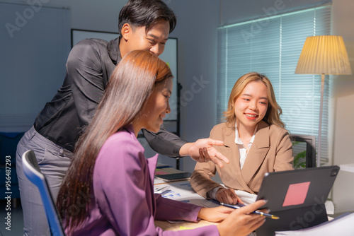 meeting, businesswoman, presentation, technology, confidence, co-worker, support, communication, smiling, professional, portrait, sitting, together, manager, table, training, happiness, digital, positive, workplace, teamwork, corporate, marketing, team, asian, business, working, computer, talking, concept, success, group, cooperation, brainstorming, businessman, casual attire, laptop, office, discussion, project, happy, education, accomplishment, management, encouragement, entrepreneur