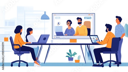 meeting, conference, video, call, online, remote, work, team, collaboration, office, business, technology, communication, connection, digital, network, virtual, global, workplace, employee, colleague, conversation, discussion, interaction, presentation, screen, computer, laptop, desktop, people, group, together, modern, contemporary, professional, efficient, productive, strategy, planning, innovation, growth, success, future
