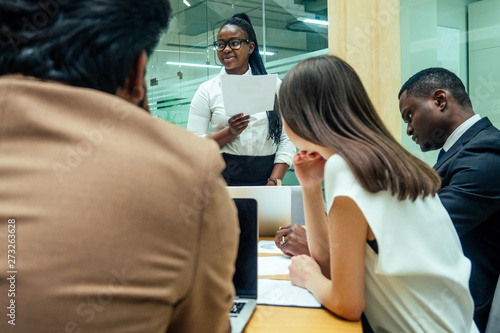 team work group of international business partners : indian,korean, afro-american people working together in modern room