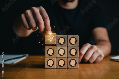 Teamwork and Innovation Concept with Wooden Blocks Representing Individual Skills and a Lightbulb Symbolizing Creative Ideas and Problem Solving in Business Strategy
