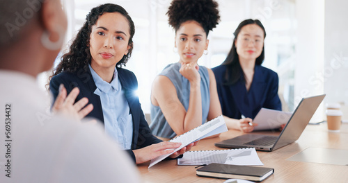 Teamwork, collaboration and business people with documents in meeting. Planning, laptop and group of women with computer and paperwork discussing sales, advertising or marketing strategy in office.