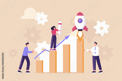 business, growth, teamwork, collaboration, rocket, launch, startup, success, progress, strategy, planning, development, innovation, goal, achievement, finance, investment, marketing, sale, project, management, cartoon, illustration, flat, design, vector, concept, idea, partnership, leadership