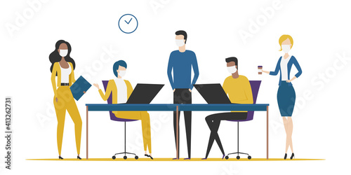teamwork, office, desk, team, colleague, office worker, white-collar, working, employee, manager, staff, office work, workplace, workspace, table, computer, laptop, people, face mask, job, mask, quarantine, pandemic, meeting, cartoon, vector, illustration, corporate, talk, business, brainstorming, group, discussion