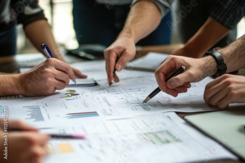teamwork meeting discussing a new project and hand pointing graph on paperwork