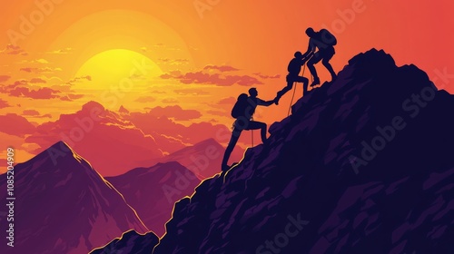 mountain, sunset, climber, teamwork, silhouette, sky, summit, orange, red, purple, cloud, rocky, landscape, achievement, success, goal, challenge, journey, adventure, cooperation, support, motivation, inspiration, nature, outdoors, hiking, climbing, rock, peak, horizon, mountainous, hill, mountain chain, mountain scenery, high altitude, vertical, infused, upward, elevation, altitude, view, panorama