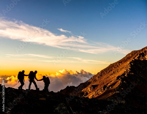Teamwork silhouette at sunrise mountain summit adventure hike