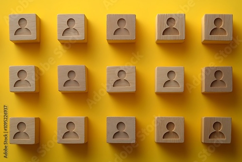 wooden blocks, yellow background, graphic design, human resources, teamwork, staff, employee, personnel, organisation, community, group, collection, topview, studio shot, vibrant color, corporate identity, manpower, staffing