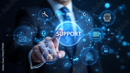 support, technical, information technology, service, client, assistance, online, concept, design, solution, globe, electronic mail, phone, headset, document, computer, lock, wrench, cloud, buttons, finger, touch, network, connection, digital, technology, cyberspace, communication, business, man, suit, interface, icon, symbol, graphic, modern, futuristic, virtual, earth, global, help, contact, art