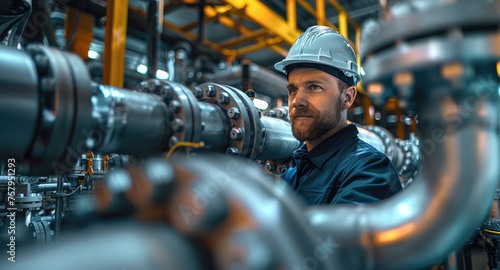 Technician meticulously adjusts industrial valves amidst a complex network of pipes, showcasing the precision and expertise needed for HVAC system tuning. Generative AI.