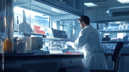 Technician preparing human cell samples under a laminar flow hood in a brightly lit research lab, with molecular biology tools and advanced culturing plates on the workbench.