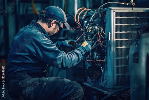 Technician Repairing Industrial Equipment in Dimly Lit Workshop